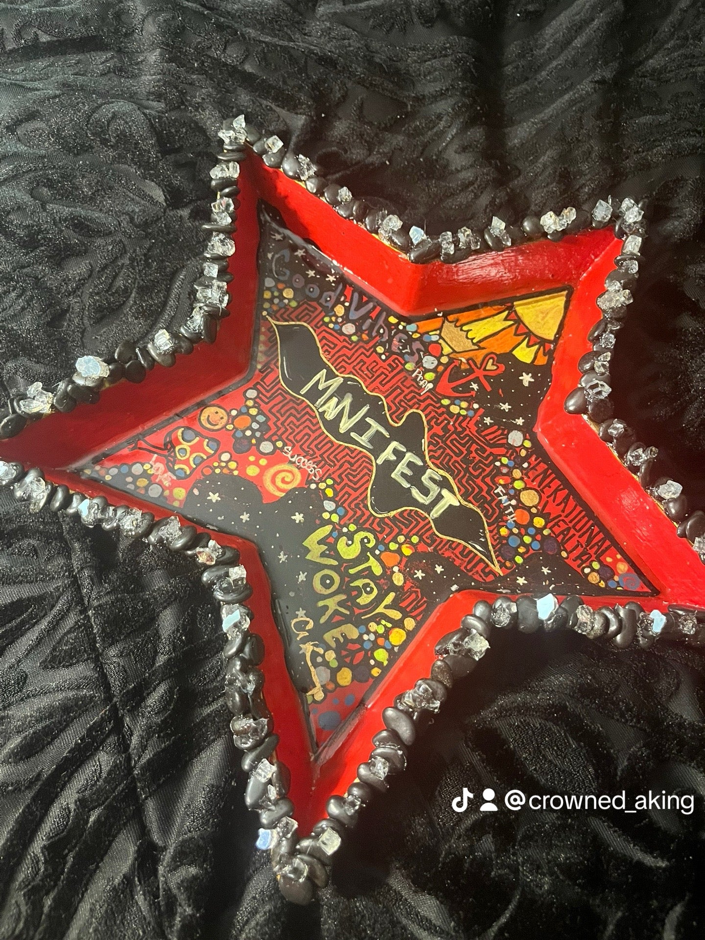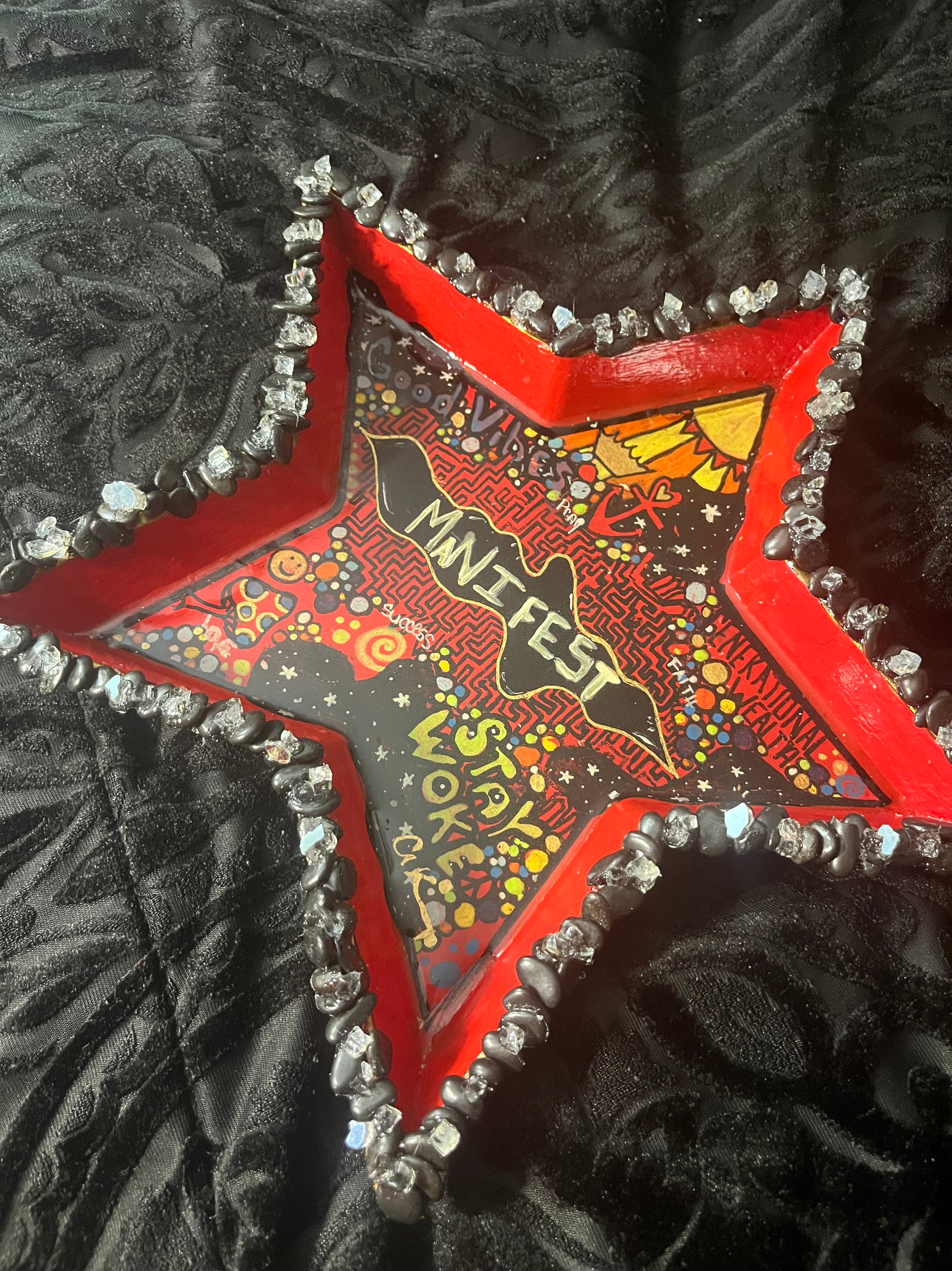 Star shaped tray with the words "manifest" in the middle. "manifest" glows in the dark. Red background with affirmations surroundsit. can be used as a ashtray, jewelry holder , or just an art piece.